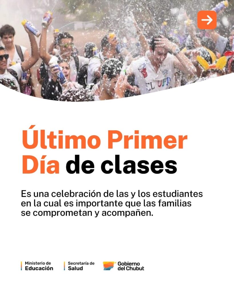 Ante el inicio del ciclo lectivo 2026, que comenzó el lunes 23 de febrero, el Gobierno del Chubut, a través del Ministerio de Educación y la Secretaría de Salud, difundió una serie de recomendaciones para acompañar los festejos por el Último Primer Día (UPD), promoviendo el cuidado y la responsabilidad compartida.